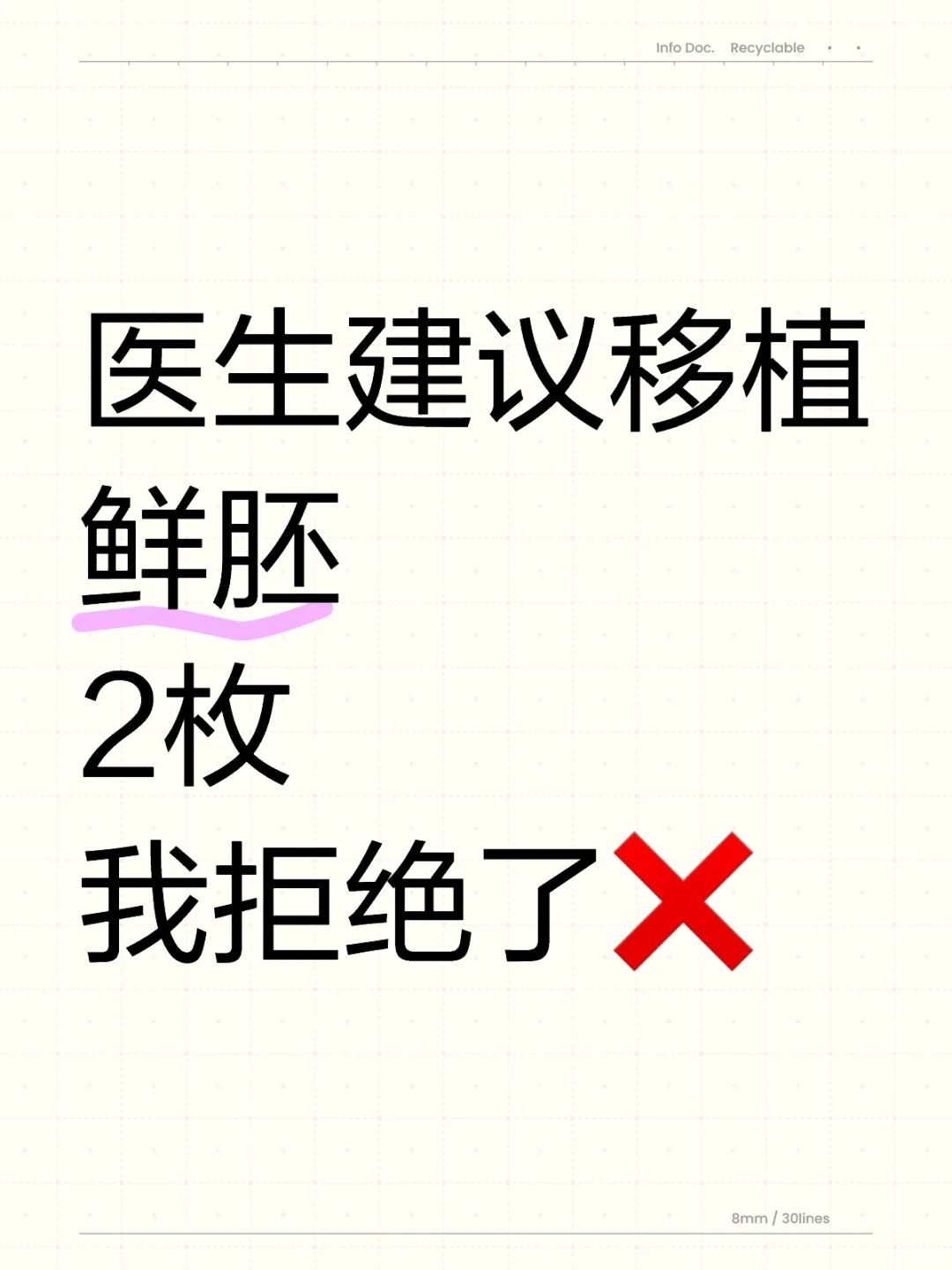我广医三院,医生说移植两枚鲜胚,特地挂号去问了另外一个医生能不能只移植一个,医生说不行,你们不专业,卵裂期本来成功率就不高,如果成了再减胎,回家!直接把我轰走了