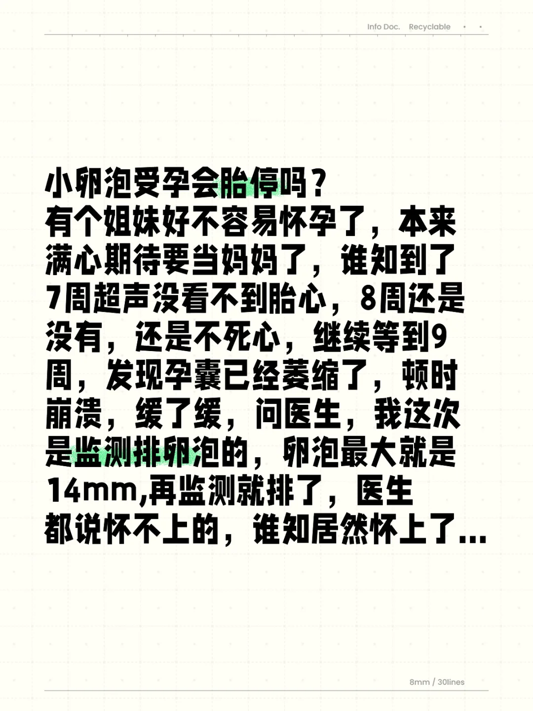 有个姐妹好不容易怀孕了,本来满心期待要当妈妈了,谁知到了7周超声没看不到胎心,8周还是没有,还是不死心,继续等到9周,发现孕囊已经萎缩了,顿时崩溃,缓了缓,问医生,我这次是监测排卵泡的,卵泡最大就是14mm,再监测就排了,医生都说怀不上的,谁知居然怀上了,会不会是小卵泡质量不好,所以胎停了?
